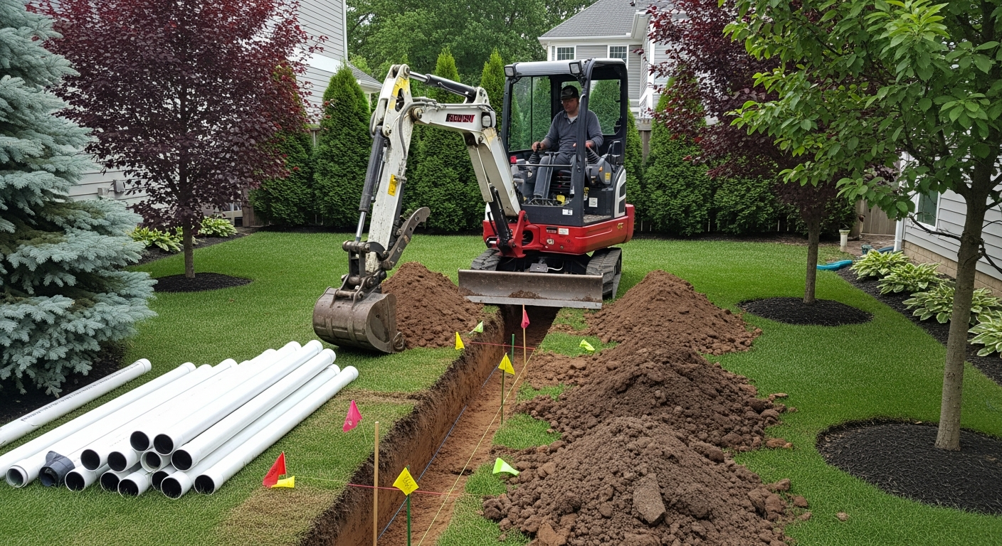 Installation de drain français, correction de drainage, gestion des eaux souterraines et de surface.